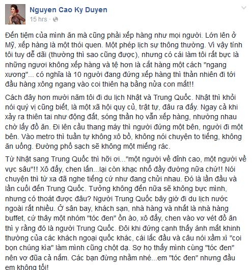Mới đây, MC Kỳ Duyên đã chia sẻ kinh nghiệm và quan điểm của mình về văn hóa xếp hàng cũng như cách ứng xử của con người tại nơi công cộng. Theo đó, chị thấy rằng nhiều người Trung Quốc còn quá nhiều hành động chưa đẹp làm ảnh hưởng đến cộng đồng người châu Á nói chung.