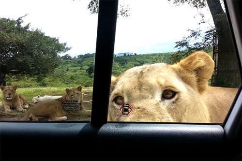 Nếu bạn ở trong trường hợp này thì sao? Bạn còn đủ dũng cảm để kể lại tường tận những gì đã xảy ra không? Một con sư tử cái trong công viên động vật hoang dã ở Nam Phi dùng răng cắn vào tay cầm và kéo cửa xe khiến du khách có mặt bên trong bị một phen hoảng sợ.