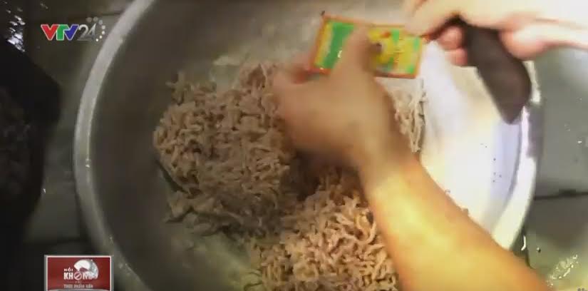 Đoạn phóng sự dài 4 phút được thực hiện tại một cơ sở sản xuất xúc xích, patê ở xã Tiên Phương, huyện Chương Mỹ (Hà Nội). Theo thông tin của phóng viên VTV, người chủ xưởng năm nay dù mới 29 tuổi nhưng đã có 14 năm kinh nghiệm trong nghề. Công suất của xưởng lên đến "cả trăm kg một ngày". Trong clip, người xem dễ dàng nhìn thấy những rổ bì lợn, nội tạng lợn được bày dàn trải trong nhà, ruồi nhặng bay khắp nơi, bu vào cả nguyên liệu chế biến.