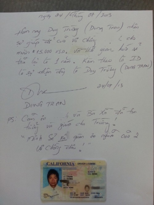 Giấy mượn nợ có bằng lái xe của ca sĩ Duy Trường