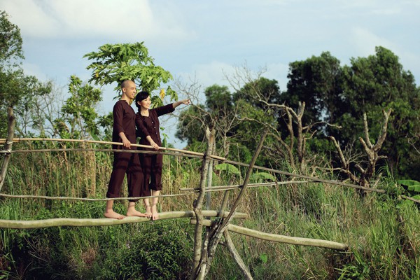 Chợ nổi, đồng lúa chín vàng , cầu khỉ, vườn trái cây , chùa cổ đặc trưng được cặp đôi đưa vào bộ ảnh dung dị của mình.