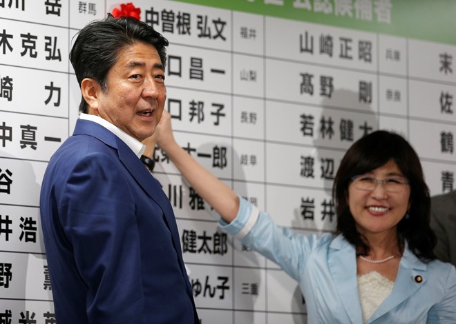Bà Inada và Thủ tướng Shinzo Abe trong đêm theo dõi bầu cử thượng viện tại trụ sở đảng LDP. Ông Abe từng công khai khẳng định bà Inada chính là ứng viên tiềm năng nhất cho chức thủ tướng. Ảnh: Reuters