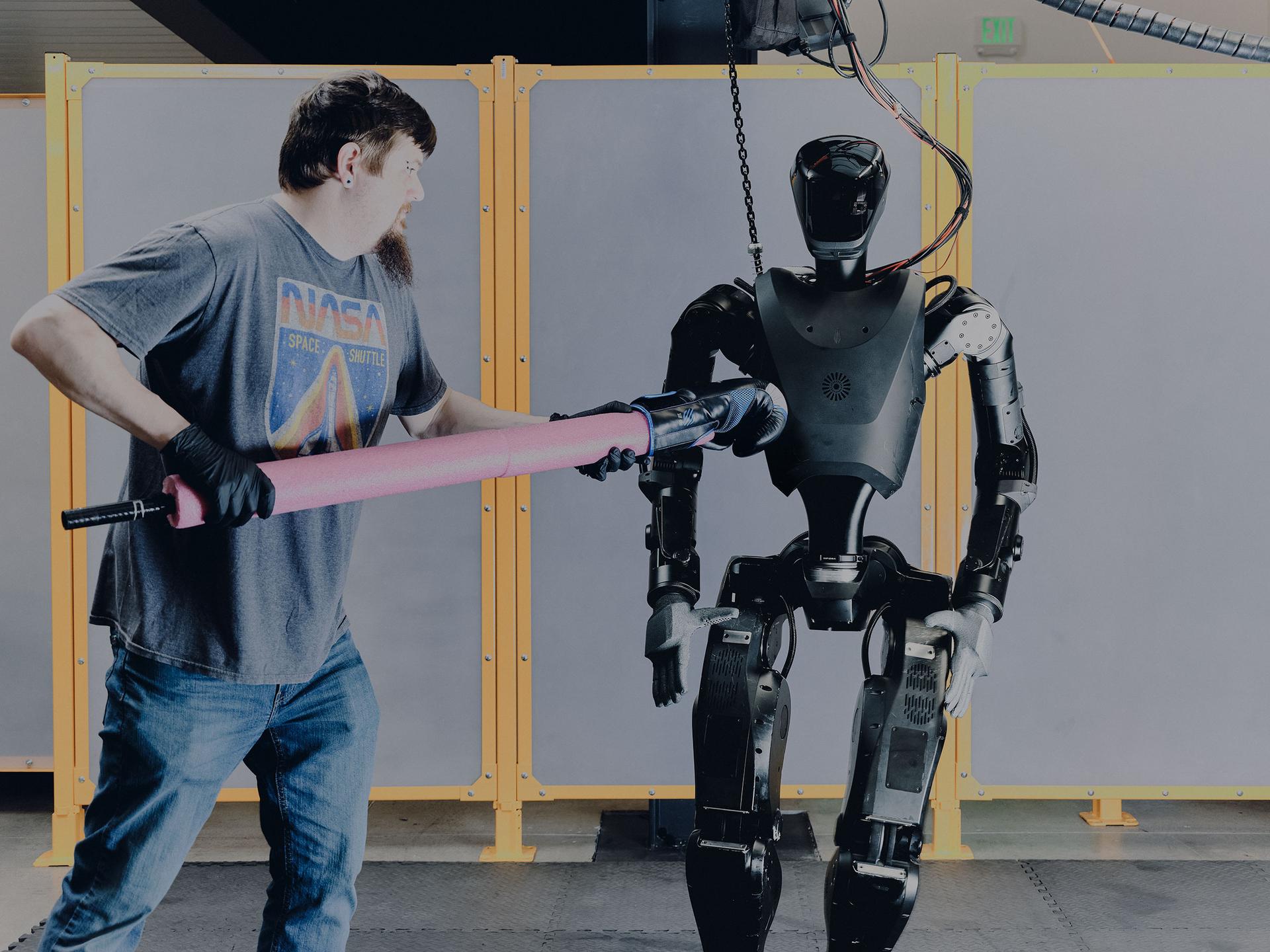 Một nhân viên đang cho kiểm tra sự ổn định của robot Phantom MK-1 với một chiếc găng tay đấm bốc mở rộng (Minh họa)