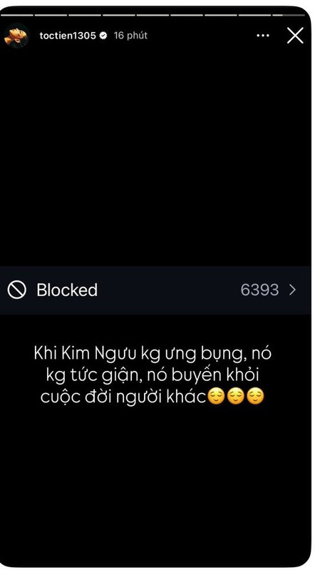 Theo như trong story Instagram, nữ ca sĩ đăng ảnh chụp màn hình danh sách tài khoản bị chặn trên trang cá nhân, kèm dòng chữ: “Blocked: 6393”. Không chỉ vậy, Tóc Tiên còn viết thêm một câu khá thẳng thắn: “Khi Kim Ngưu không ưng bụng, nó không tức giận, nó biến khỏi cuộc đời người khác”, khiến nữ ca sĩ này đã vội lên tiếng đính chính.