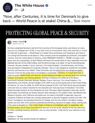 Các nhà lãnh đạo thế giới đã chỉ trích tuyên bố của Tổng thống Mỹ Donald Trump ngày 17 tháng 1 về việc áp thuế 10% đối với tám quốc gia châu Âu không ủng hộ nỗ lực của ông trong việc mua lại Greenland vì lý do an ninh quốc gia. Ông Trump nói rằng nếu Mỹ không giành được quyền kiểm soát, Trung Quốc hoặc Nga sẽ chiếm lấy nó.