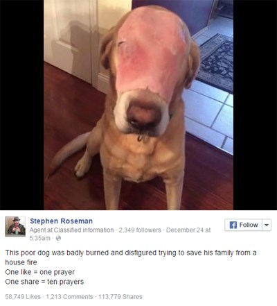 Thành viên Stephen Roseman cũng đã lợi dụng điều này để tạo nên một cú lừa ngoạn mục. Anh đăng ảnh với lời chú thích: "Chú chó này bị bỏng nặng khi cố gắng cứu gia đình chủ nhân khỏi đám cháy. Mỗi like là một lời cầu nguyện và mỗi lượt chia sẻ là 10 lời cầu nguyện cho chú".