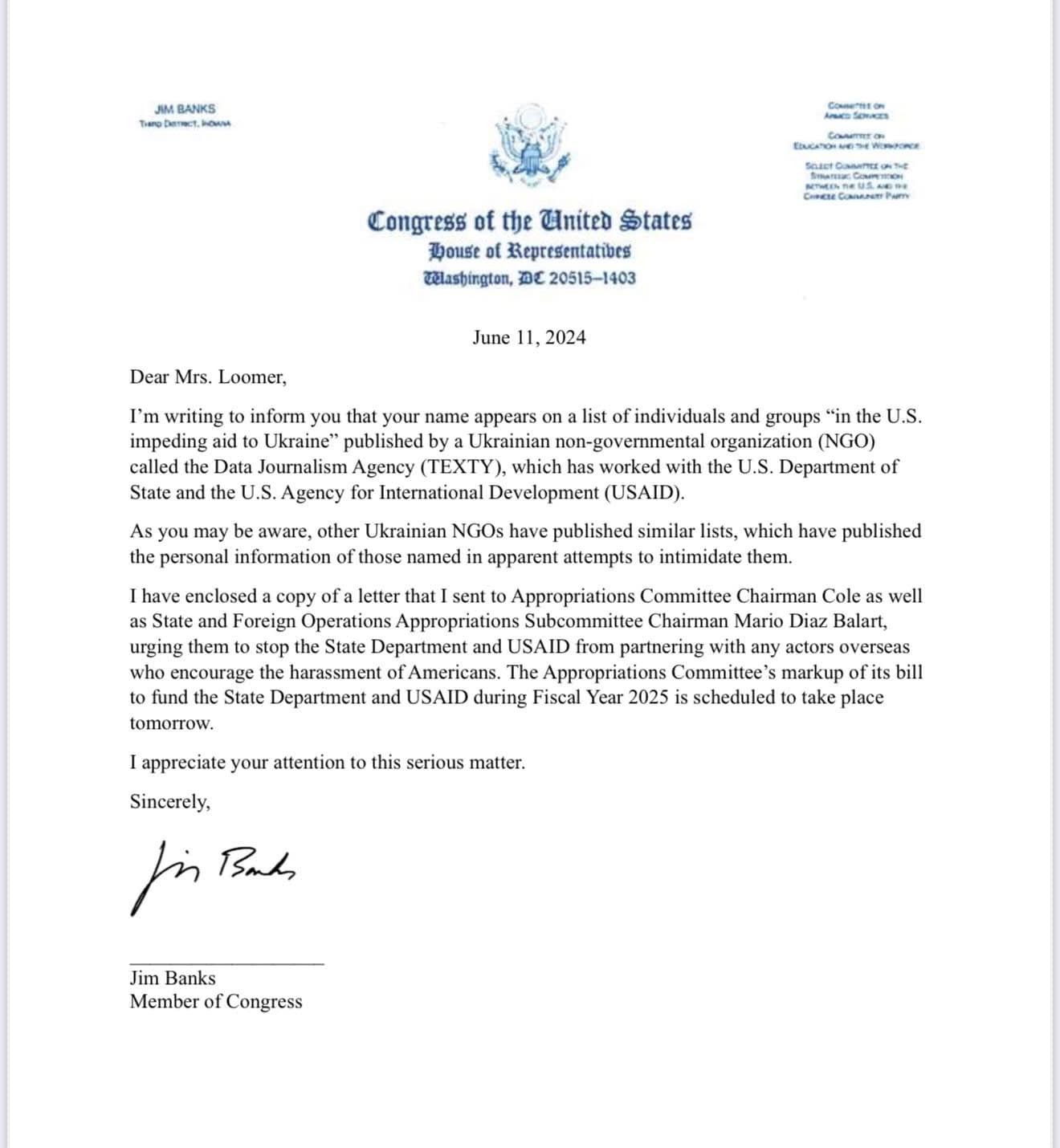 Thư này do Dân biểu Jim Banks gửi cho bà Loomer ngày 11/6/2024 để nhắc cho sự an toàn cá nhân bà, vì sự việc này nghiêm trọng.