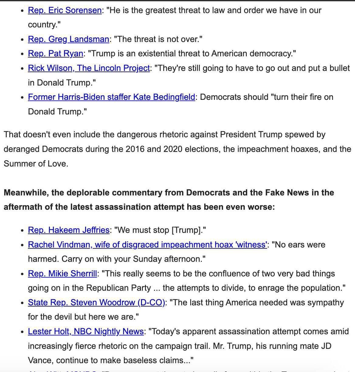 Nếu đảng Dân chủ tin vào tuyên bố của họ rằng luận điệu của đảng Cộng hòa về vấn đề nhập cư gây ra bạo lực chống lại người nhập cư - không có bằng chứng nào cho thấy điều đó - thì việc họ gọi Trump là "mối đe dọa đối với nền dân chủ" và "phải bị loại bỏ" có thể gây ra bạo lực chống lại đảng Cộng hòa là điều hợp lý.
